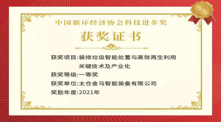 金馬裝備榮獲“中國循環(huán)經濟協(xié)會科學技術獎一等獎”